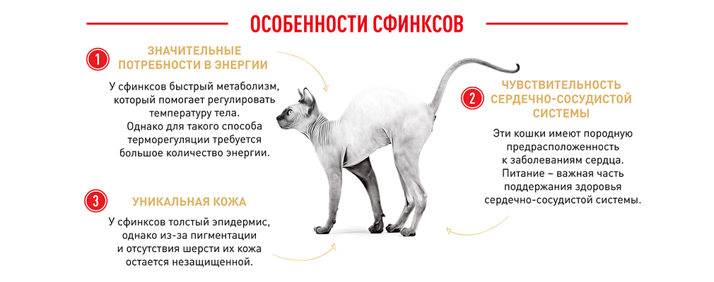 Отсутствие шерстного покрова у сфинксов компенсируется очень активным обменом веществ, позволяющим регулировать температуру тела. В то же время для такой терморегуляции необходимо очень много энергии, которую может обеспечить только правильно подобранное питание.