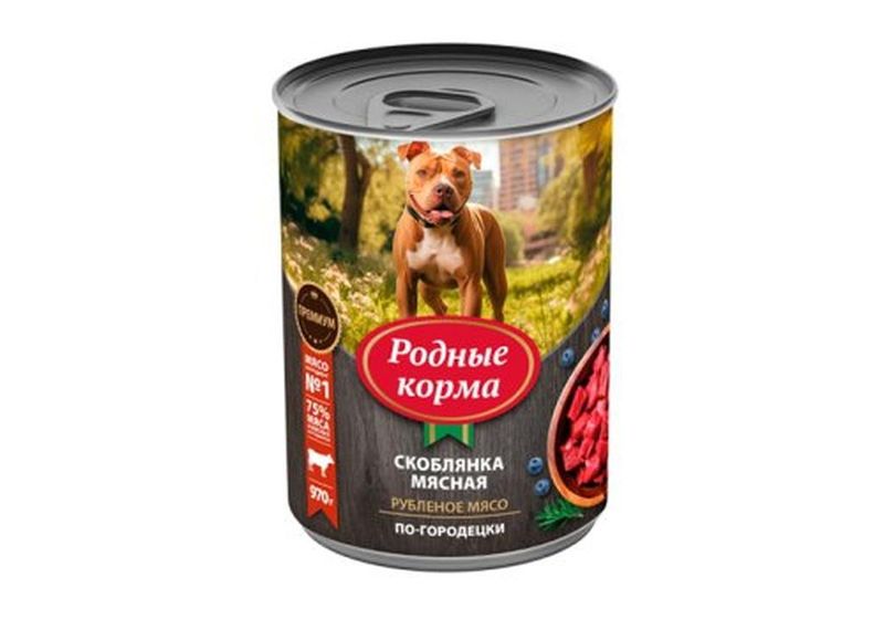 ГлавнаяКаталогКорм для собак → Родные корма, Консервированный корм для собак "скоблянка мясная по-городецки", банка